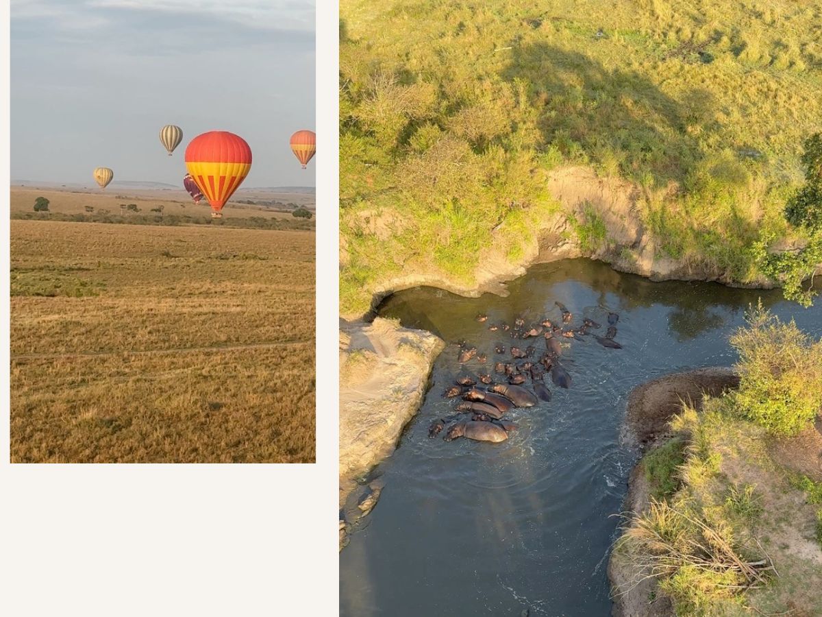 Just before sunrise, climb into a hot air balloon basket and silently lift above the savanna. Below you, rivers wind through grasslands, herds move like living brushstrokes, and the Mara glowing gold in the morning light.